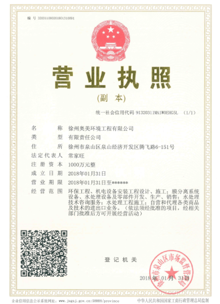 為更好的開(kāi)拓公司業(yè)務(wù),優(yōu)化公司的戰略布局,增強公司盈利能力,進(jìn)一步提高公司綜合競爭力,公司與徐州泉山經(jīng)濟開(kāi)發(fā)區投資發(fā)展有限公司聯(lián)合成立徐州奧美環(huán)境工程有限公司。近日,該控股子公司已完成工商注冊登記手續,并取得徐州市泉山區市場(chǎng)監管局核發(fā)的《營(yíng)業(yè)執照》,2018奧美環(huán)境進(jìn)入開(kāi)枝散葉階段!
