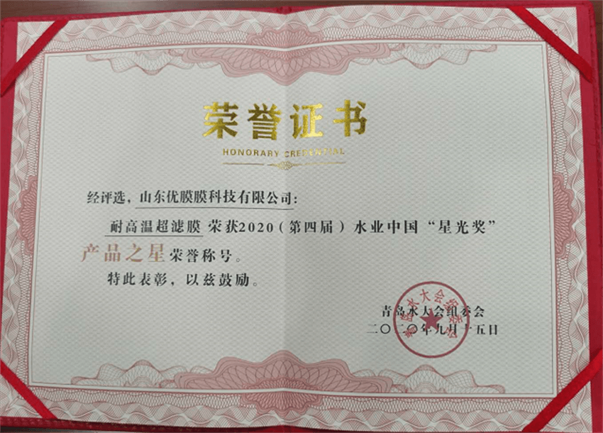 本次大會(huì )設立了2020(第四屆)水業(yè)中國“星光獎”“產(chǎn)品之星”的評選活動(dòng),參與評選的產(chǎn)品都是來(lái)自全國各地的具有雄厚實(shí)力企業(yè)的拳頭產(chǎn)品,經(jīng)歷層層評選,山東優(yōu)膜膜科技有限公司耐高溫超濾膜憑借優(yōu)越的化學(xué)穩定性和超高的耐溫性能一舉獲得了2020年第四屆水業(yè)中國“星光獎”“產(chǎn)品之星”的榮譽(yù)稱(chēng)號,在此,特別感謝組委會(huì )對優(yōu)膜科技耐高溫超濾膜給予的高度肯定。