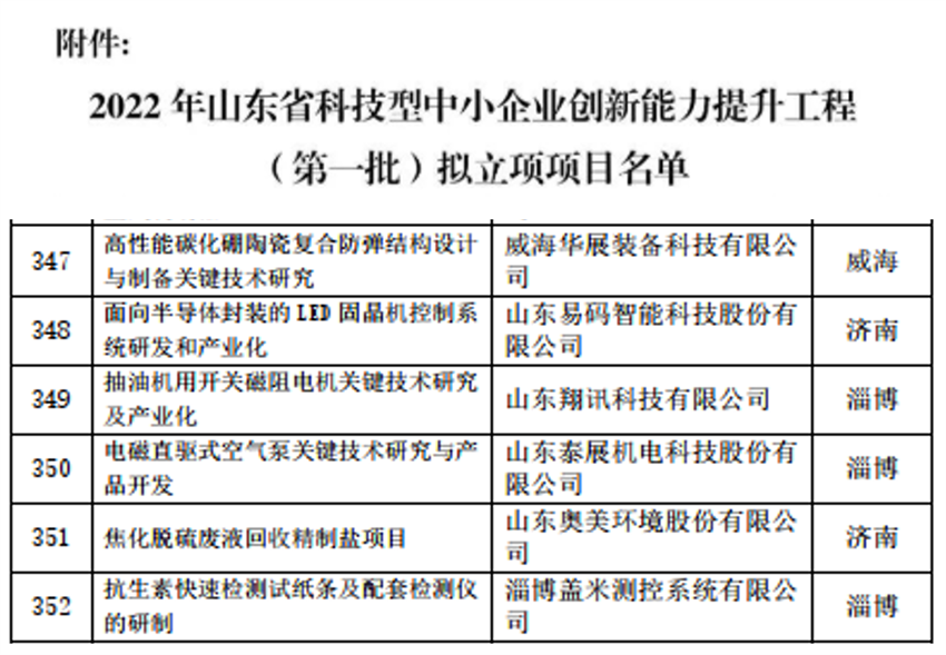 7月1日,山東省科學(xué)技術(shù)廳對2022年山東省科技型中小企業(yè)創(chuàng )新能力提升工程(第一批)擬立項項目名單進(jìn)行公示,其中山東奧美環(huán)境股份有限公司申報的“焦化脫硫廢液回收精制鹽項目”入選。