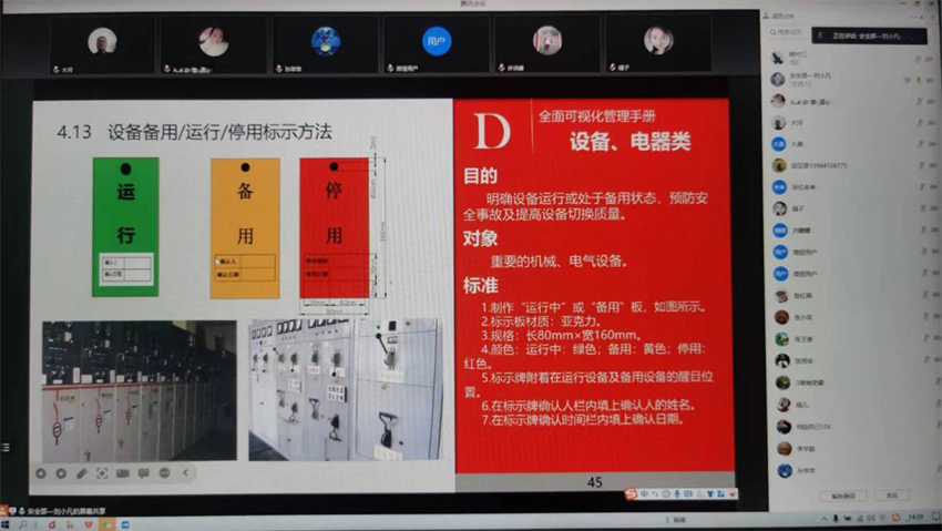 為切實(shí)做好常態(tài)化疫情防控工作,確保公司各項工作有序開(kāi)展,11月25日下午14:00,我司通過(guò)“騰訊會(huì )議”召開(kāi)2022年6S安全生產(chǎn)管理工作線(xiàn)上會(huì )議,安排公司下一步標準化生產(chǎn)、管理的各項工作。會(huì )議由安全部劉小凡主持,公司董事長(cháng)竇大河、總經(jīng)理姚付江、總監李學(xué)勤及辦公室、車(chē)間生產(chǎn)人員參加。